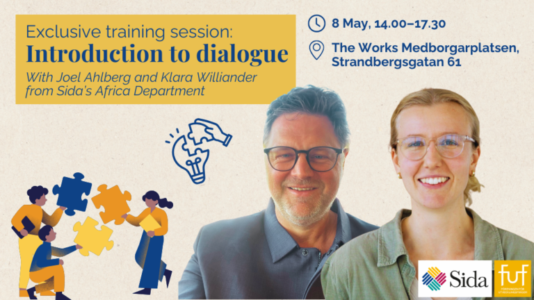 Sessionen leds av Joel Ahlberg, expert inom fred och säkerhet, och Klara Williander, expert inom miljö och klimat, båda från Sida Afrikaavdelning. De har mångårig erfarenhet av att arbeta med dialog och praktisk konflikthantering. Joel är även författare till den kommande boken Dialog och deltagande, som ges ut i vår.