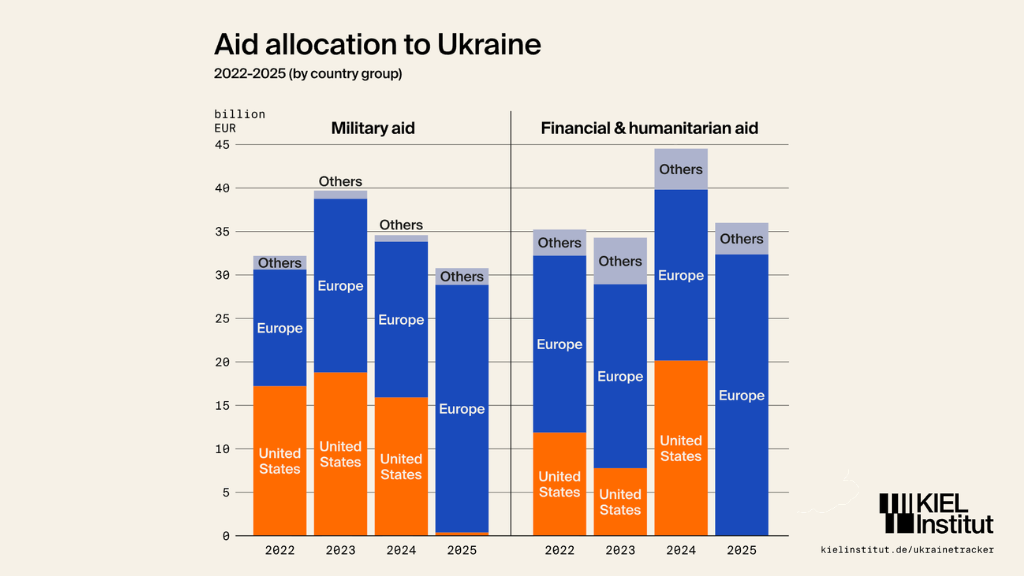 Kiel Institutets ”Ukraine Support Tracker” har följt det militära, finansiella och humanitära stödet till Ukraina sedan 2022. Under 2025 nollades i princip det amerikanska stödet, medan europeiska aktörer väsentligen ökat sitt stöd har det inte uppnått samma nivåer som året dessförinnan.