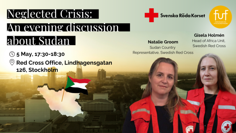 FUF and the Swedish Red Cross invite you to an after-work seminar with Gisela Holmén, Head of the Africa Unit, and Natalie Groom, Country Representative for Sudan. Join us to learn more about this crisis, share reflections, and take part in a discussion on one of today’s most urgent yet overlooked crises.